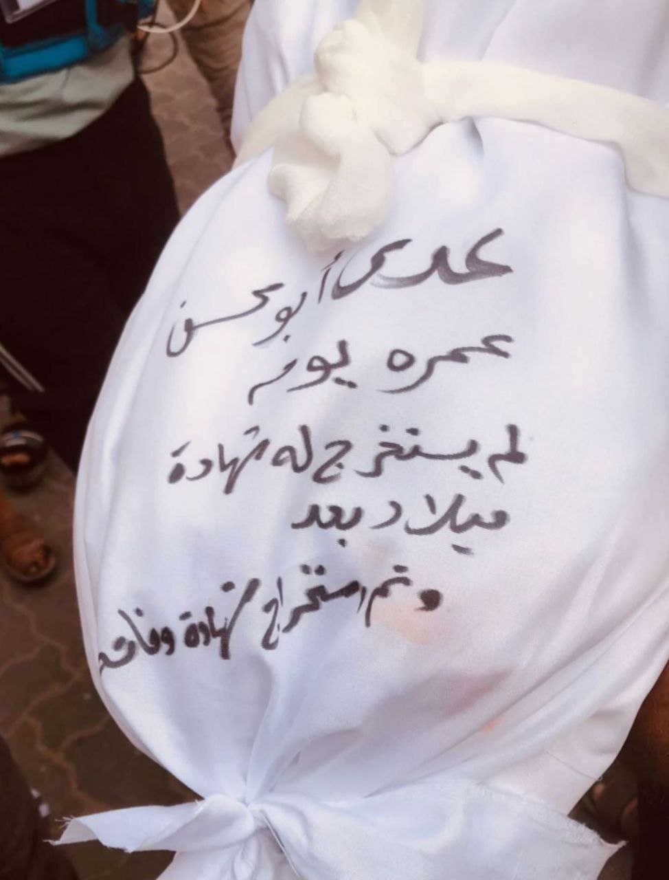 توضیح عکسِ بالا: عدی ابومحسن متولد غزه، تنها یک روز سن داشت، گواهیِ شهادتِ او قبل از صدورِ شناسنامه اش صادر شد. 🕯