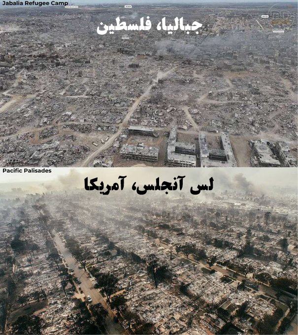 خسارتی که رژیم صهیونیستی با بمب های اهدایی آمریکا بعد از یکسال بمباران به غزه وارد کردند: ۵۰ میلیارد دلار. & خسارتی که تا الان با آتش سوزی به لس آنجلس وارد شده: ۱۳۵ میلیارد دلار!!! راستش را بخواهید هیچکدوم ازین اخبار و تصاویر، داغِ حتی یک کودک از هزاران کودکِ فلسطینی را که بی رحمانه شهید شدند، خنک نمی کند!