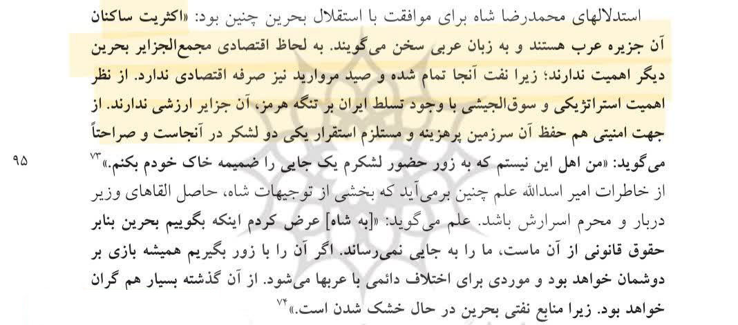 🟦 ببینید با چِه دلایلِ واهی و دروغینی استان چهاردهم ایران رو دادن رفت: استدلال هایِ محمّد رضا پهلوی برایِ موافقت با استقلال بحرین چنین بود: اکثریتِ ساکنانِ آن جزیره عرب هستند و بِه زبانِ عربی سخن می گویند. بِه لحاظِ اقتصادی مجمع الجزایر بحرین دیگر اهمیّتی ندارد؛ زیرا نفتِ آنجا تمام شده و صیدِ مروارید نیز صرفۀ اقتصادی ندارد! از نظر اهمیتِ استراتژیکی و سوق الجیشی با وجودِ تسلطِ ایران بر تنگه هرمز، آن جزایر ارزشی ندارد! از جهت امنیتی هم حفظِ آن سرزمین پرهزینه و مستلزمِ استقرارِ یکی دو لشکر در آنجاست و صراحتا می گوید: من اهلِ این نیستم که بِه زورِ حضورِ لشکرم یِک جایی را ضمیمه خاکِ خودم بکنم.