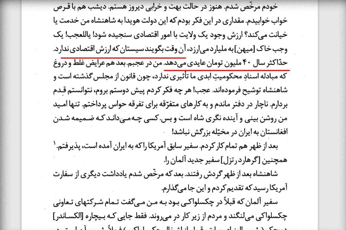 🟦 دیدگاه پهلوی نسبت بِه سیستان: دولت هویدا: سیستان ارزشِ اقتصادی ندارد، حداکثر ۴۰ میلیون تومان عایدی می دهد؛ اسدالله علم: مقداری در این فکر بودم که این دولتِ هویدا به شاهنشاه خدمت می کند یا خیانت!