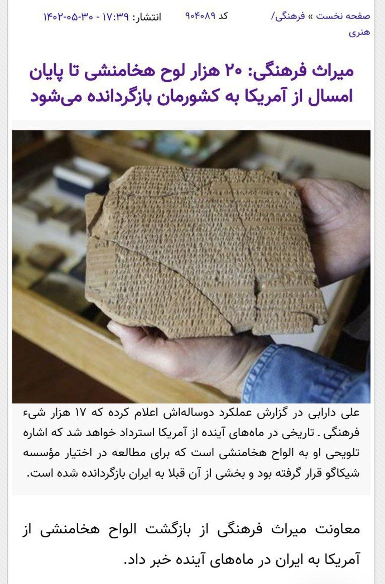 🔴 این الواح در دورانِ پهلوی و بِه علتِ بی عرضگی پهلوی بِه آمریکا داده شد؛ بعد از انقلاب اسلامی، جمهوری اسلامی ۴۰ سال در مجامعِ بین المللی در پیِ بازگشت این آثارِ ایرانی شد که بالاخره موفق و قرار شده تا پایانِ سال بِه کشور بازگردانده شود؛ برخلاف تبلیغاتِ باستان گرایان، مطلبِ فوق نشان می دهد جمهوری اسلامی برایِ آثارِ هنرِ ایرانی چِه ارزشی قائل هست.