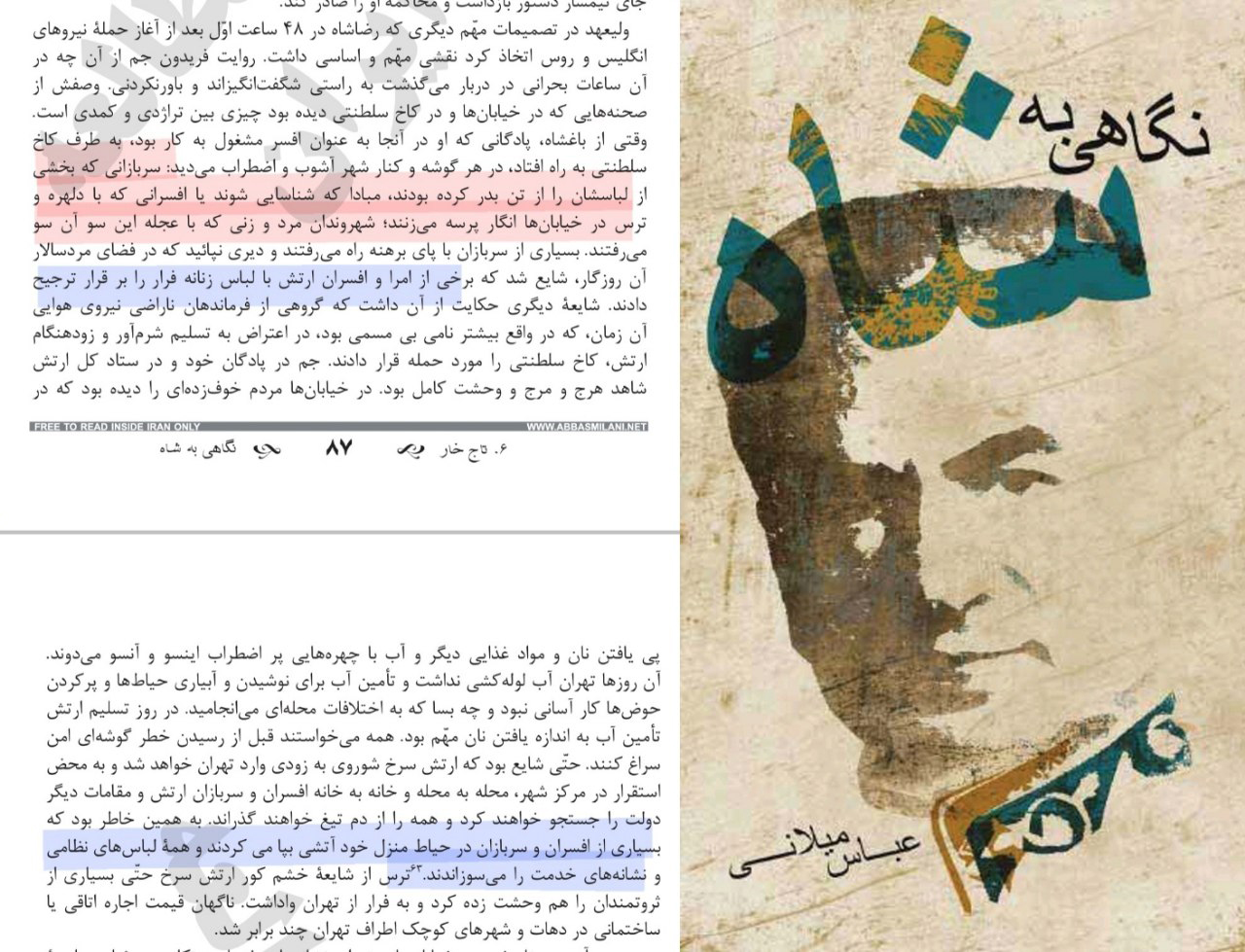 🟦 ارتشِ مدرنِ رضاخان و فرار با لباسِ زنانه: بعد از حملۀ متفقین بِه ایران در شهریور ۱۳۲۰، فریدون جم از نزدیکانِ رضاخان وضعیتِ سربازان و افسرانِ رضاخان را چنین گزارش می دهد: سربازانی که بخشی از لباسشان را از تن بِه در کرده بودند، مبادا که شناسایی شوند، یا افسرانی که با دلهره و ترس در خیابان ها انگار پرسه می زنند، شهروندانِ مرد و زنی که با عجله این سو و آن سو می رفتند. بسیاری از سربازان با پای برهنه راه می رفتند و دیری نپائید که در فضایِ مردسالارِ آن روزگار، شایع شد که برخی از امرا و افسرانِ ارتش با لباسِ زنانه فرار را بر قرار ترجیح دادند.