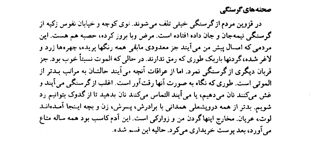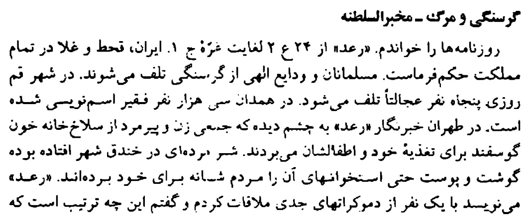 🟦 روزنامه ها را خواندم. رعد، ایران، قحط و غلا در تمامِ مملکت حکم فرماست. مسلمانان و ودایع الهی از گرسنگی تلف می شوند. در شهر قم روزی پنجاه نفر عجالتاً تلف می شود. در همدان سی هزار نفر فقیر اسم نویسی شده است. در طهران خبرنگار رعد، به چشم دیده که جمعی زن و پیرمرد از سلاخ خانه، خونِ گوسفند برایِ تغذیۀ خود و اطفالشان می بردند. شتر مُرده ای در خندقِ شهر افتاده بوده، گوشت و پوست حتی استخوانهای آن را مردم شبانه برایِ خود برده اند.