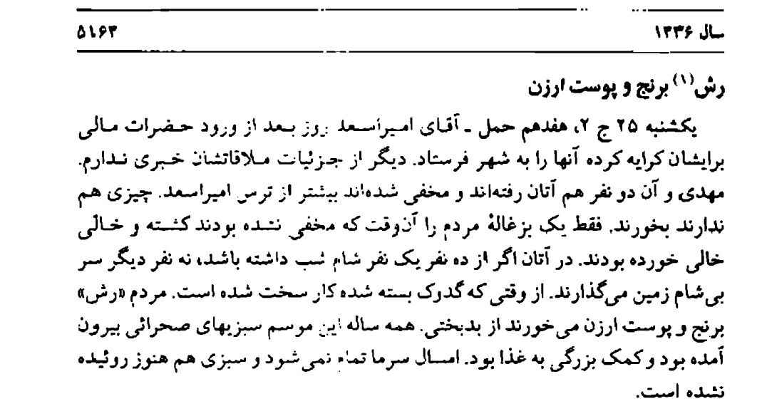 🟥 آقای امیراسعد روز بعد از ورودِ حضرات مالی برایشان کرایه کرده آنها را به شهر فرستاد. دیگر از جزئیاتِ ملاقاتشان خبری ندارم. مهدی و آن دو نفر هم آنان رفته اند و مخفی شده اند بیشتر از ترسِ امیر اسعد. چیزی هم ندارند بخورند، فقط یک بزغالۀ مردم را آن وقت که مخفی نشده بودند، کشته و خالی خالی خورده بودند. در آنان اگر از ده نفر یک نفر شامِ شَب داشته باشد، نُه نفر دیگر سرِ بی شام زمین می گذارند. از وقتی که گدوک بسته شده، کار سخت شده است. مردم رشِ¹ برنج و پوستِ ارزن می خورند از بدبختی. همه ساله این موسم سبزیهایِ صحرائی بیرون آمده بود و کمکِ بزرگی بِه غذا بود. امسال سرما تمام نمی شود و سبزی هم هنوز روئیده نشده است.