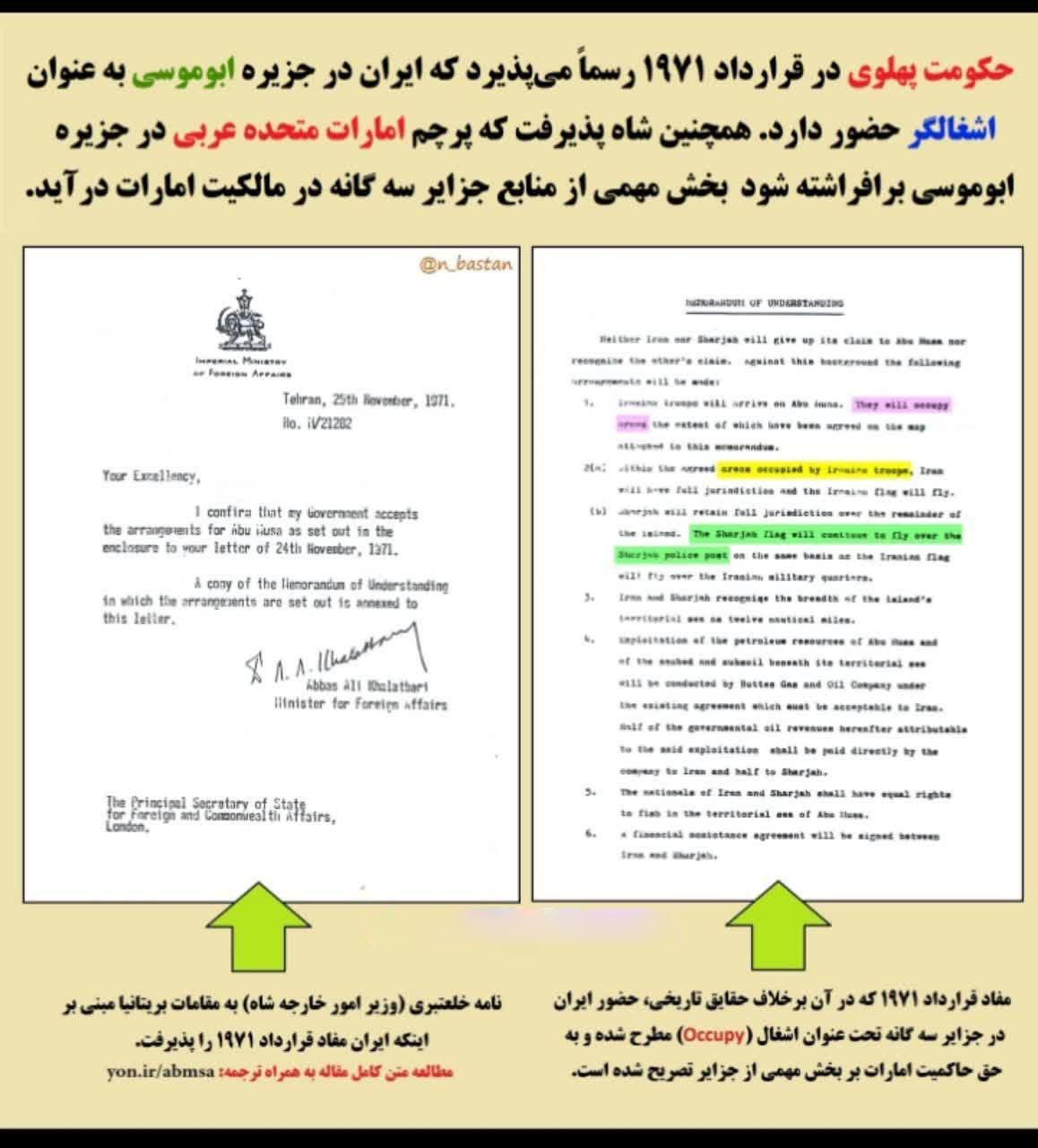 🟦 می دانید قضیه جزایرِ سه گانه چیست که هر سال امارات و کشورهایِ عربی، ایران را محکوم می کنند: محمّد رضا پهلوی آنها رو هم داده بود بِه امارات!! امّا انقلاب می شود و امام بِه زور آنها را پس می گیرد؛ بیش از ۴۰ ساله امارات طبقِ قرارداد محمّد رضا پهلوی که مشاهده می کنید از ایران در مجامع بین المللی شکایت می کند که جزایر را پس بدهید.