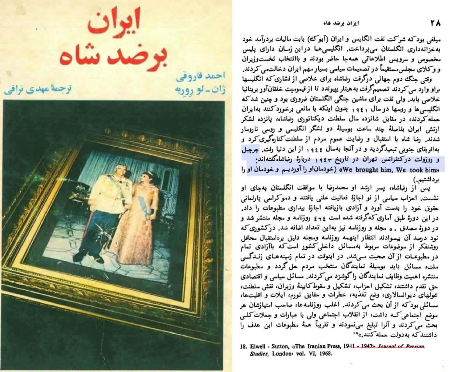 🟦 رضاخان و اوجِ تحقیرِ ملّتِ ایران: بعد از واقعه شهریور ۱۳۲۰ و تسخیر چند روزه ایرانِ رضاخان توسطِ متفقین، سالِ ۱۳۲۲ رزولت (رئیس جمهور امریکا) و چرچیل (نخست وزیر بریتانیا) بِه ایران آمدند و دربارۀ رضاخان چنین گفتند: We brought him, We took him؛ خودمان او را آوردیم و خودمان او را برداشتیم؛ این یعنی اوجِ حقارتِ یک ملّت که نفرِ نخستِ آن کشور توسطِ سایرِ کشورها نصب و عزل شود!
