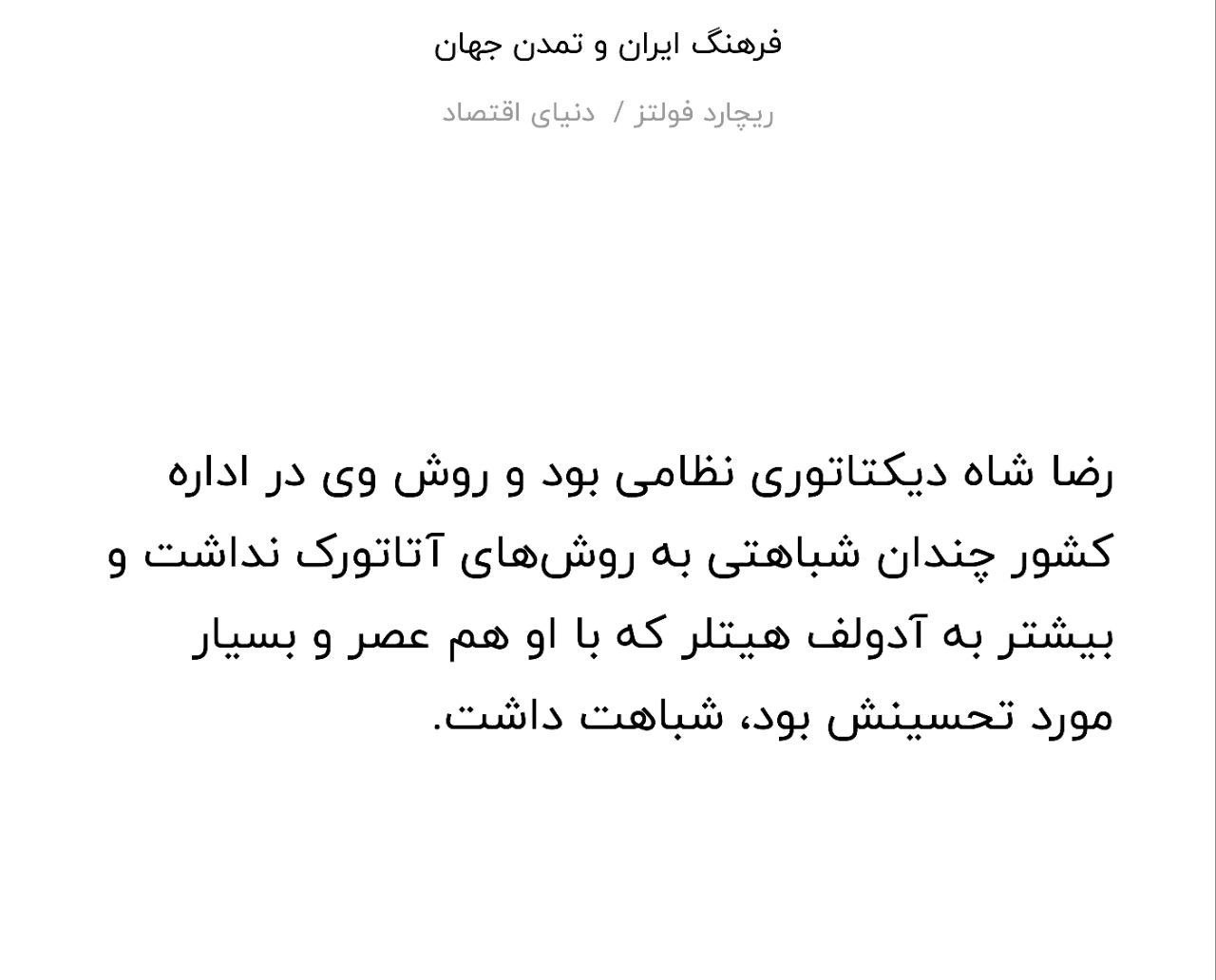 🟦 ریچارد فولتز ایران شناس کانادایی: رضا خان دیکتاتوری نظامی بود و روشِ وی در اداره کشور چندان شباهتی بِه روش هایِ آتاتورک نداشت و بیشتر بِه آدولف هیتلر که با او هم عصر و بسیار موردِ تحسینش بود، شباهت داشت.