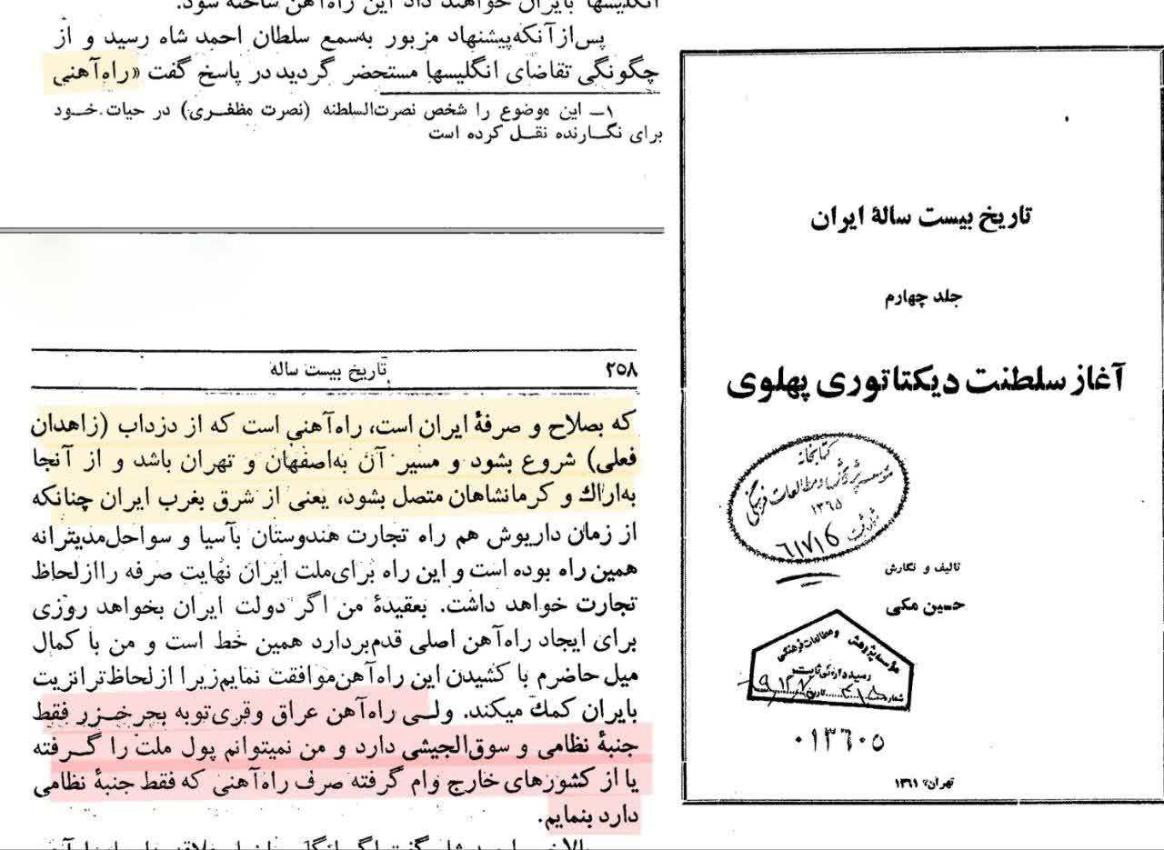 🟥 بِه عقیدۀ من اگر دولتِ ایران بخواهد روزی برایِ ایجاد راه آهنِ اصلی قدم بردارد همین خط است و من با کمالِ میل حاضرم با کشیدن این راه آهن موافقت نمایم، زیرا از لحاظِ ترانزیت بِه ایران کمک می کند؛ ولی راه آهنِ عراق بِه سمتِ بحرِ خزر فقط جنبۀ نظامی و سوق الجیشی دارد و من نمی توانم پولِ ملّت را گرفته یا از کشورهایِ خارج وام گرفته صرفِ راه آهنی که فقط جنبۀ نظامی دارد بنمایم.