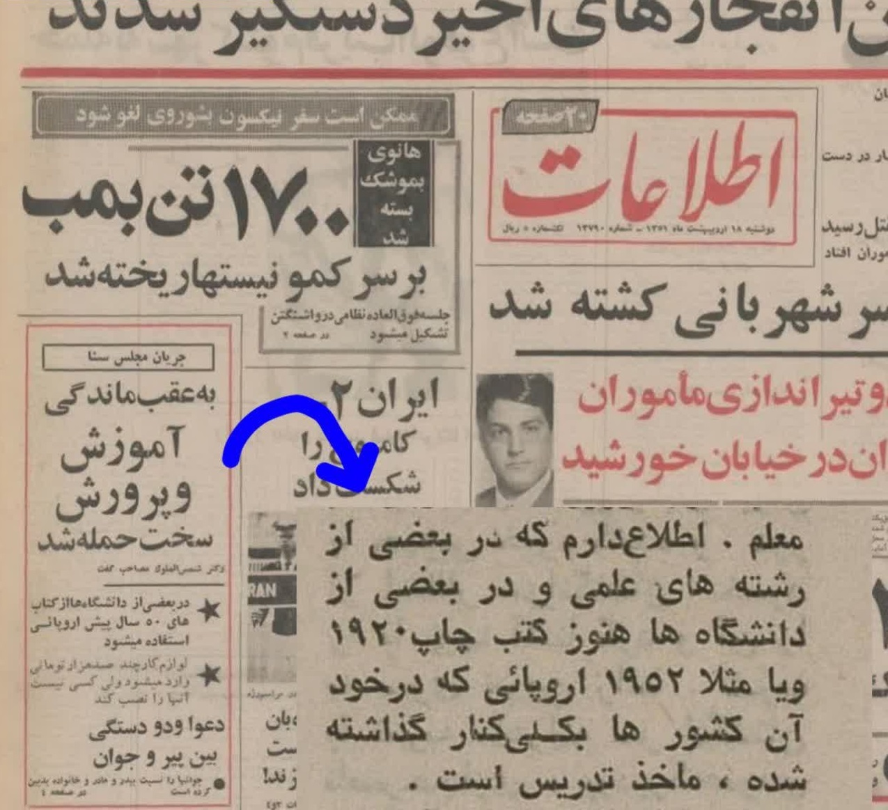 🟦 عقب ماندگی علمی زمان محمّد رضا پهلوی: در سال ۱۳۵۱ شمسی در دروسِ دانشگاهیِ بعضی دانشگاه ها از کتاب هایِ ۵۰ سال پیش، یعنی چاپ سال ۱۲۹۹ شمسی (۱۹۲۰ میلادی)، اروپایی ها تدریس می شود، که خودِ اروپایی، دیگر آن کتب را تدریس نمی کنند.
