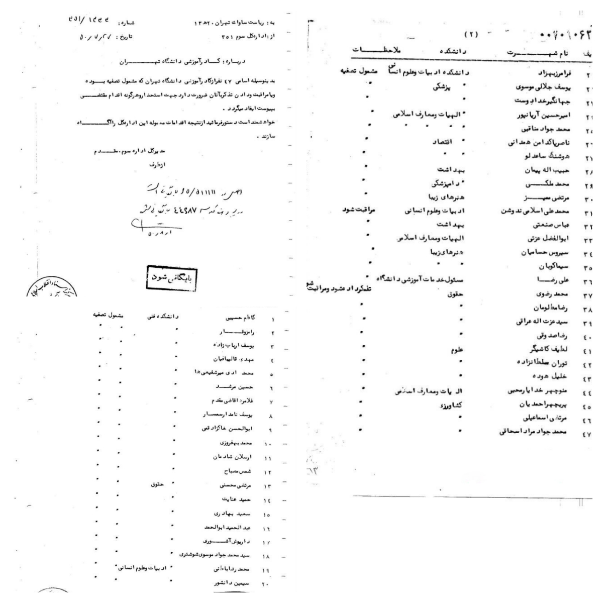🟦 فهرستی ۴۷ نفره از اساتید به نام دانشگاه تهران (از جمله سیمین دانشور، محمد علی اسلامی ندوشن و...) که در نامه ای بِه تاریخ ۲۷ مهر ماه ۱۳۵۰، جهت تصفیه بِه ریاستِ ساواک تهران ارسال شده است!
