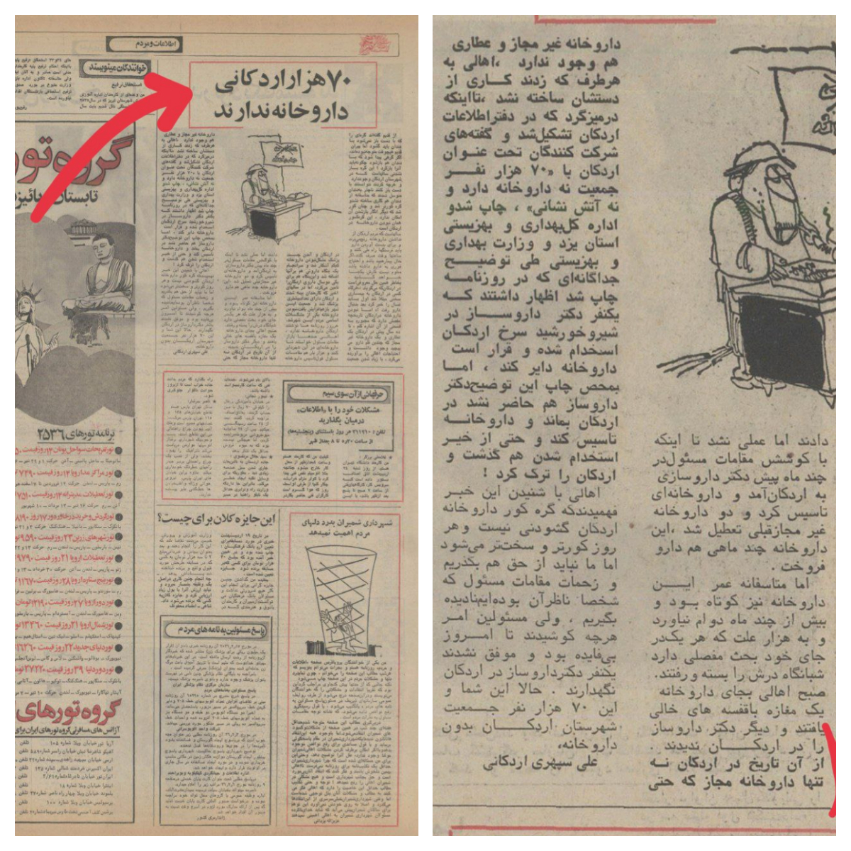 🟦 خدمات پهلوی، شهر ۷۰ هزار نفری اردکان حتی یک داروخانه هم ندارد: اردکانی ها برایِ تهیّه دارو باید ۱۲۰ کیلومتر راه بروند! دقت کنید سال ۵۶ است! ۵۰ سال از حکومتِ پهلوی گذشته و بعضی شهرهایِ ایران حتی داروخانه هم ندارند!