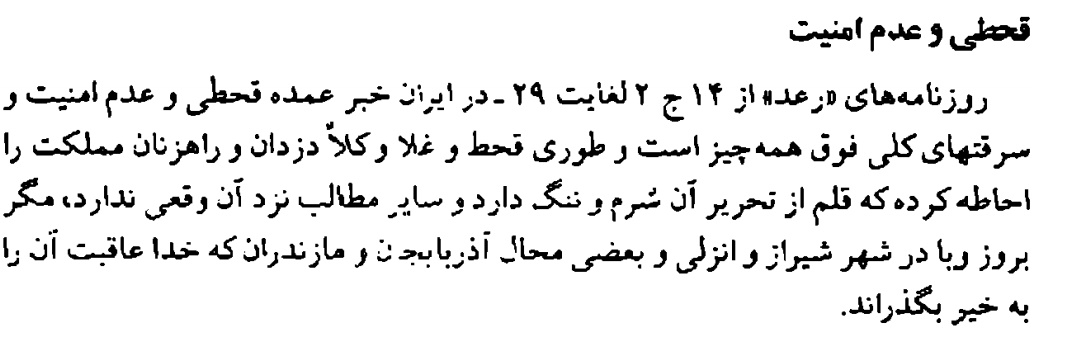 🟦 روزنامه های رعد، در ایران خبر عمده قحطی و عدمِ امنیت و سرقت های کلی، فوقِ همه چیز است و طوری قحط و غلا و کلاً دزدان و راهزنان مملکت را احاطه کرده که قلم از تحریرِ آن شرم و ننگ دارد و سایرِ مطالب نزد آن وقعی ندارد، مگر بروز وبا در شهر شیراز و انزلی و بعضی محال آذربایجان و مازندران که خدا عاقبت آن را بِه خیر بگذراند.