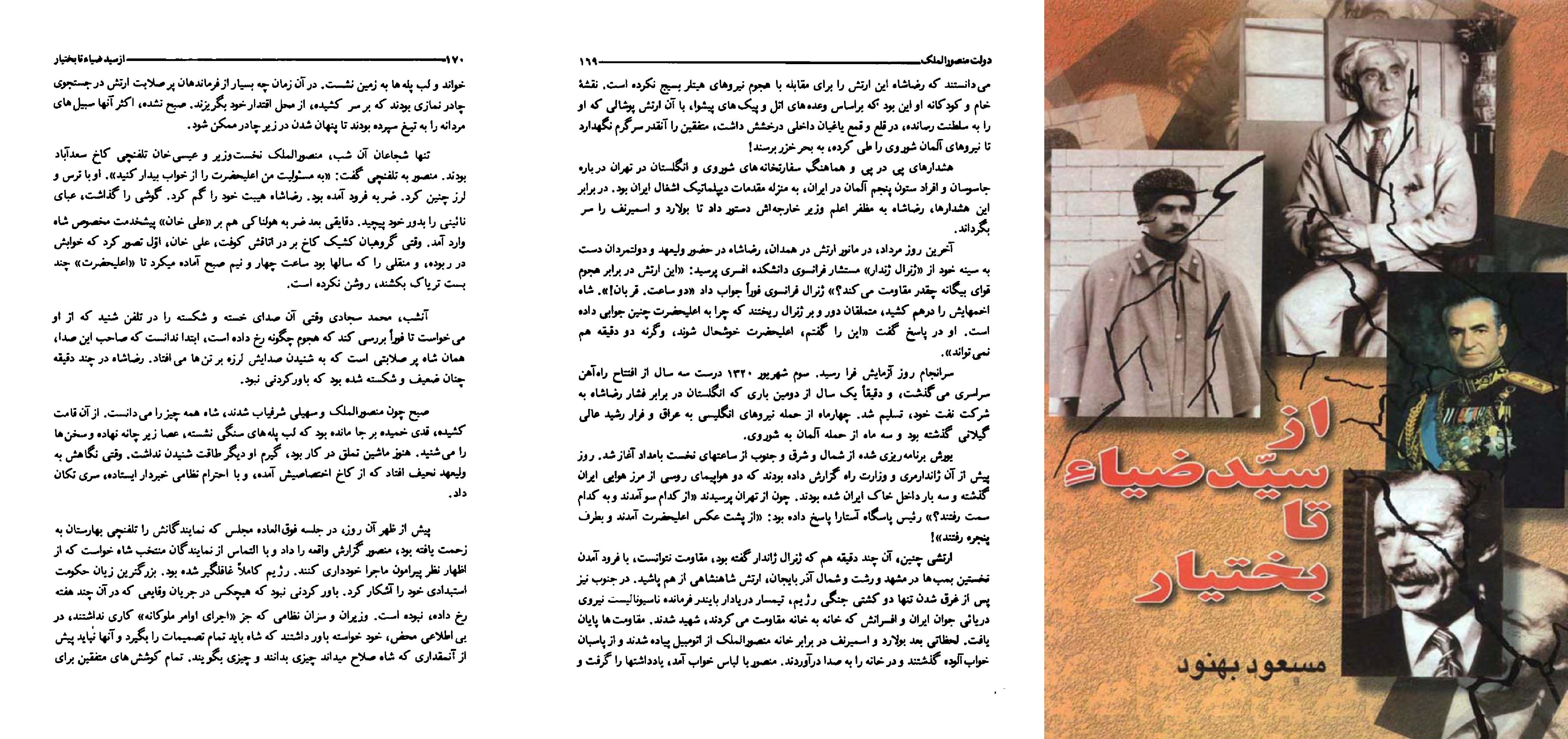 🟥 تنها شجاعانِ آن شَب، منصورالملک نخست وزیر و عیسی خان تلفنچی کاخ سعد آباد بودند. منصور به تلفنچی گفت: «به مسئولیت من اعلیحضرت را از خواب بیدار کنید». او با ترس و لرز چنین کرد. ضربه فرود آمده بود. رضاشاه هیبتِ خود را گم کرد. گوشی را گذاشت، عبایِ نائینی را به دورِ خود پیچید. دقایقی بعد ضربه هولناکی هم بر علی خان پیشخدمتِ مخصوصِ شاه وارد آمد. وقتی گروهبانِ کشیکِ کاخ بر درِ اتاقش کوفت علی خان، اوّل تصور کرد که خوابش در ربوده، و منقلی را که سالها بود ساعتِ چهار و نیم صبح آماده می کرد تا «اعلیحضرت» چند بست تریاک بکشند، روشن نکرده است.